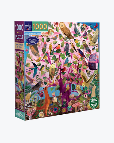 A luminous gathering of songbirds and other wildlife, hosted by an assortment of owls, evocatively rendered by Claire Westwood. Made with recycled board and printed on FSC®-certified paper using vegetable-based inks.